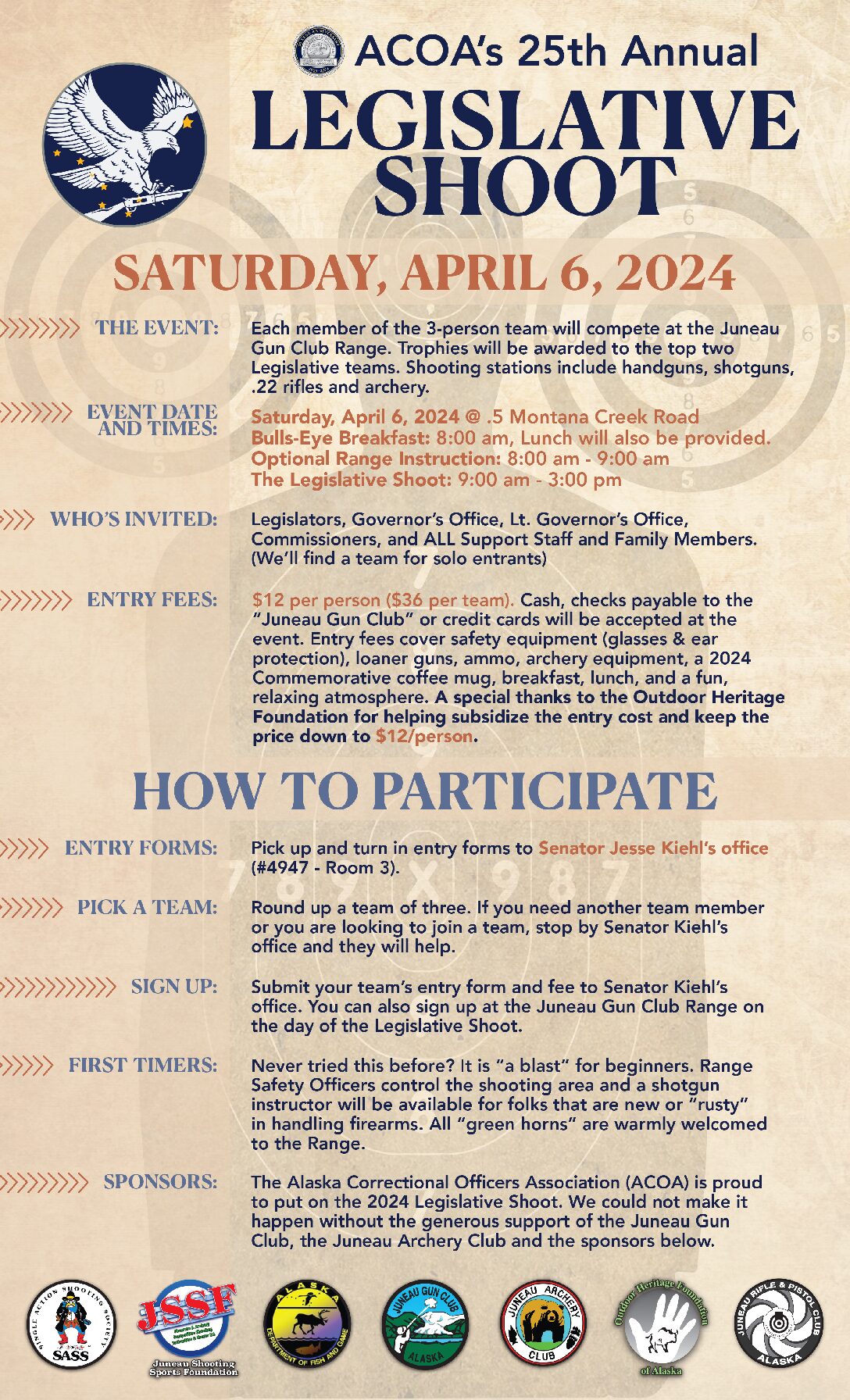THE EVENT: Each member of the 3-person team will compete at the Juneau Gun Club Range. Trophies will be awarded to the top two Legislative teams. Shooting stations include [...]