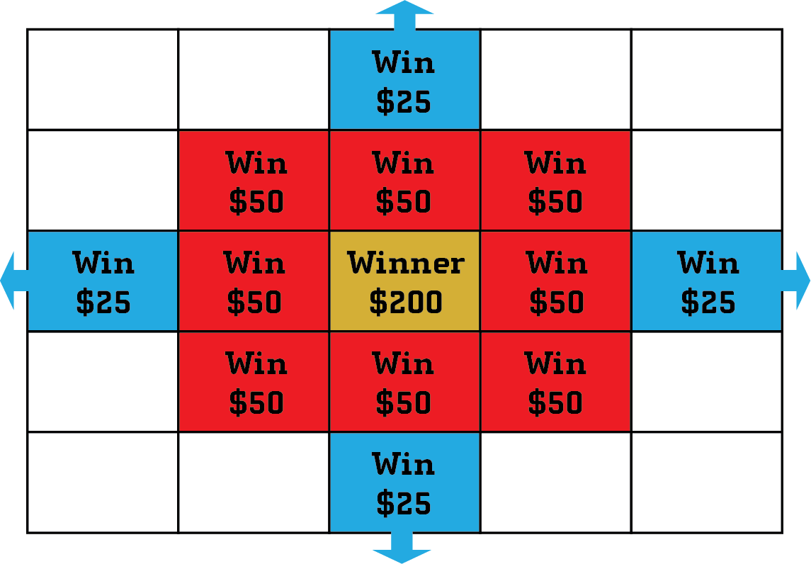 If your number is in a square touching the winning square, you will win $50. In the example, each of the squares touching the winning square from the 1st way to win above will each win $50.