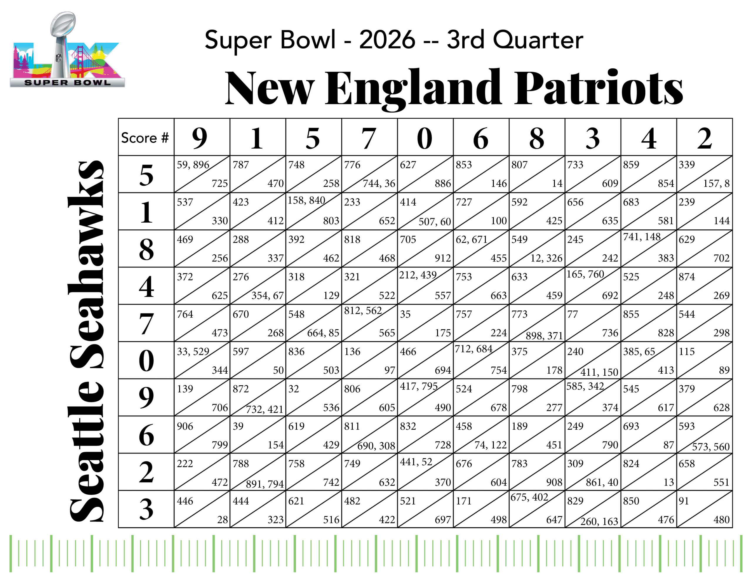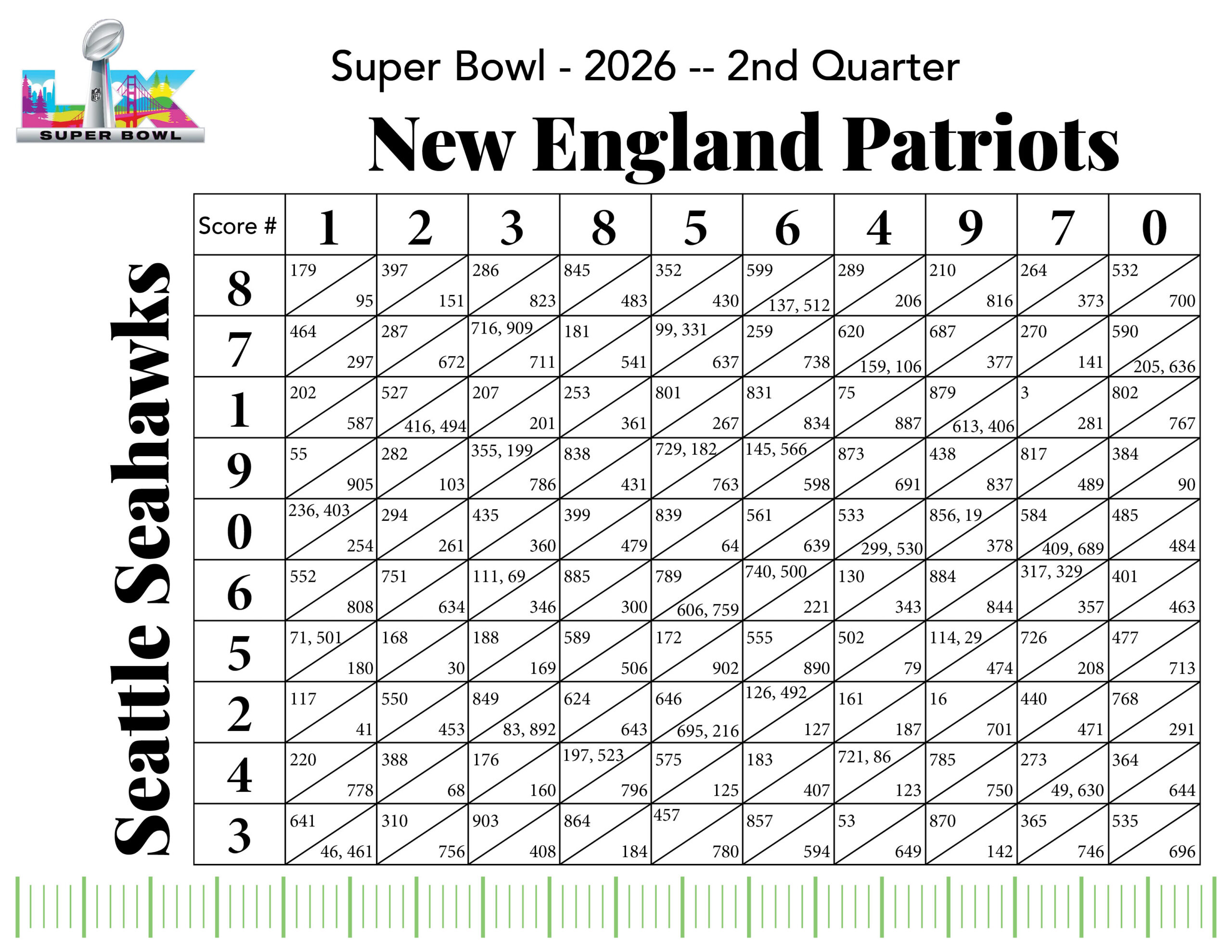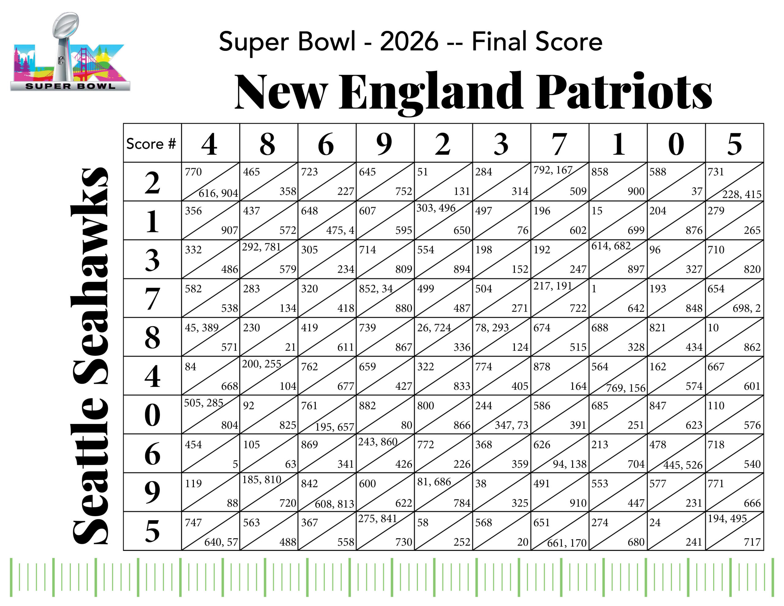 The winning squares are determined by each team’s score at the end of each quarter and if there is overtime, instead of the 4th quarter, the final score. You win $200 if your number is in the winning square. Example: Let’s say the square with your number is under the heading “Seahawks” 7 and “Patriots” 0 in the second quarter. If the Seahawks’ score is 7, 17, 27, or, 37 and the Patriots’ score is 0, 10, 20, or 30 at the end of the 2nd quarter, you, and the other Officer(s) in your square, each win $200.